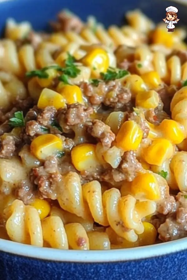 - In a large bowl, combine cooked pasta, ground beef mixture, corn, and cheese sauce. Mix until well combined.